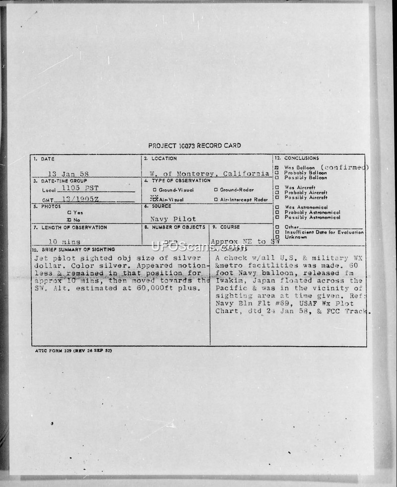 A Navy pilot reported an unidentified object over Monterey, California, on 13 January 1958. Subsequent investigation identified the object as a high-altitude Navy weather balloon released from Japan.
