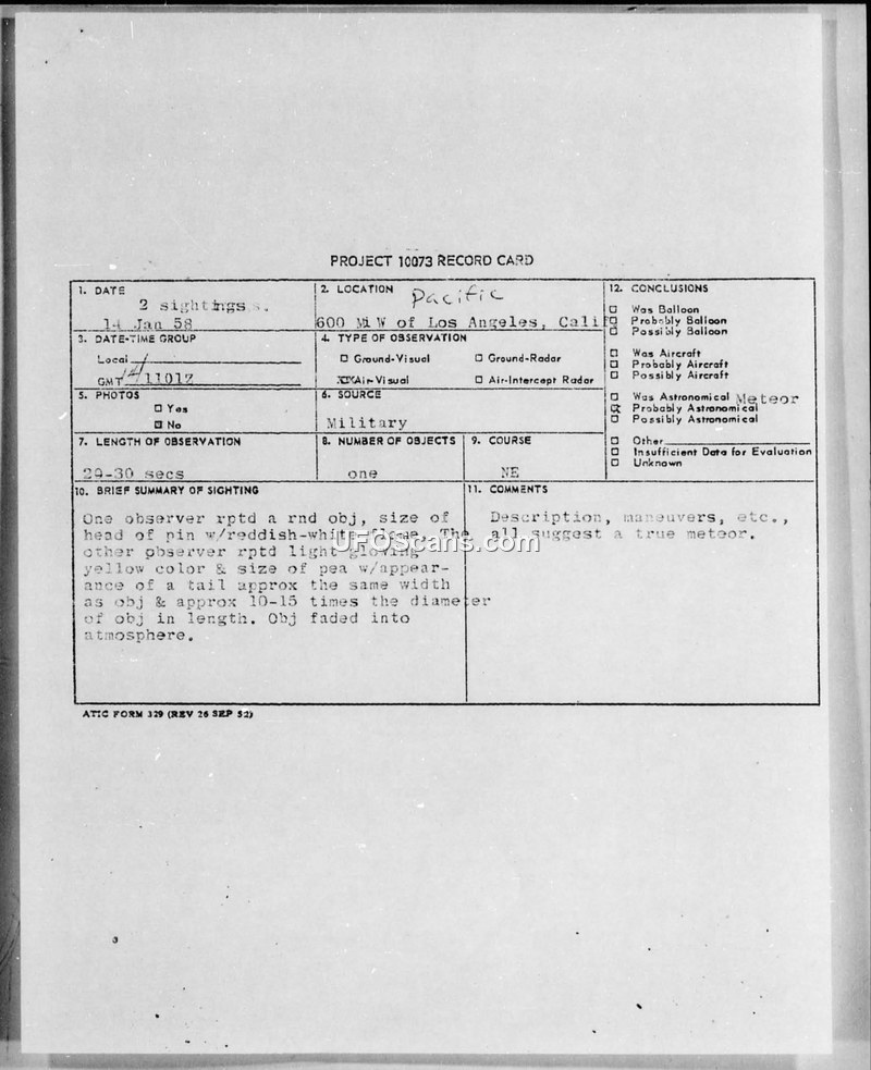 A B-47E air crew reported a glowing, round object with a tail over the Pacific Ocean on 14 January 1958. While the official intelligence report concluded it was a meteor, handwritten notes on the document reveal internal disagreement and mention corroborating reports from Navy vessels.