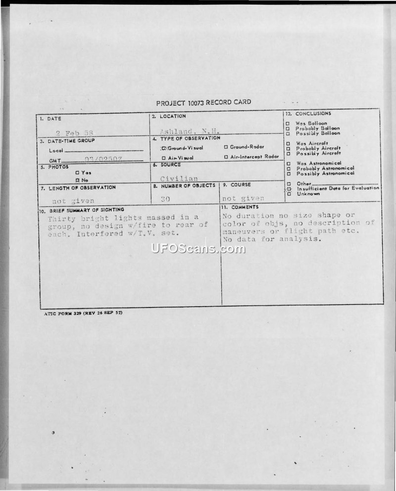 A 1958 report details a sighting of thirty bright lights in Ashland, New Hampshire, which caused television interference. The military investigation concluded the event was likely an optical illusion due to insufficient data.