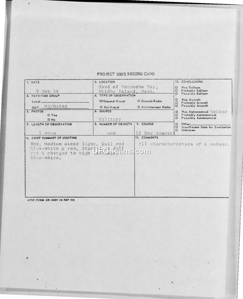 A military witness reported a 3-second aerial sighting over Whidby Island on February 2, 1958. While the witness believed the object moved too slowly to be a meteor, official evaluators concluded it was a meteor.