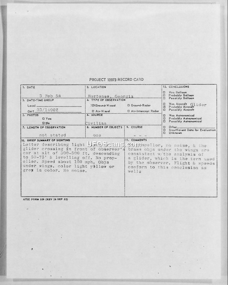 Project 10073 Record Card: Sighting near Hortense, Georgia, 3 February 1958