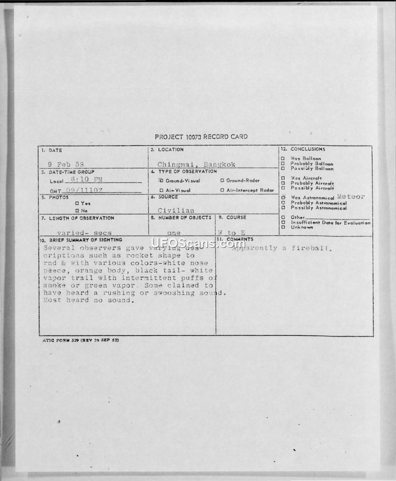 On February 9, 1958, multiple witnesses in Chiengmai, Thailand, observed an unidentified object moving at high speed from west to east. Descriptions varied, with some observers reporting a rocket-shaped object featuring a white nose, orange body, and black tail, while others noted a ball of fire with a white vapor trail. Estimates of the object's altitude ranged from 600 to 800 feet, though a French priest located 60 miles west of the city estimated it at 2,000 feet. While some witnesses reported a rushing or swooshing sound, the majority heard nothing. The following day, reports emerged from the town of Sankampaeng suggesting the object had crashed in the mountains, with witnesses claiming to have felt tremors consistent with an explosion. A subsequent investigation led by the American Consulate, involving local officials and police, included a search of the area by Land Rover and on foot, as well as a limited search by a Thai police helicopter. These efforts yielded no physical evidence. The American Consul, William E. Hussey, concluded that the object was likely a fireball, noting that while witness accounts of a horizontal flight path were inconsistent with typical meteorite trajectories, the Consulate would take no further action. The report was reviewed by Dr. Robinson and Captain Brayong, who noted that similar fireball reports had been filed in 1957.