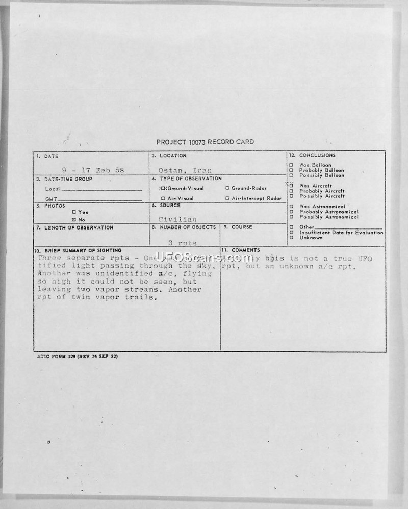 Intelligence reports from 1958 document three sightings of high-altitude objects over Iran, which were officially identified by the USAF as likely Soviet twin-jet aircraft (BADGER or FLASHLIGHT) leaving contrails.