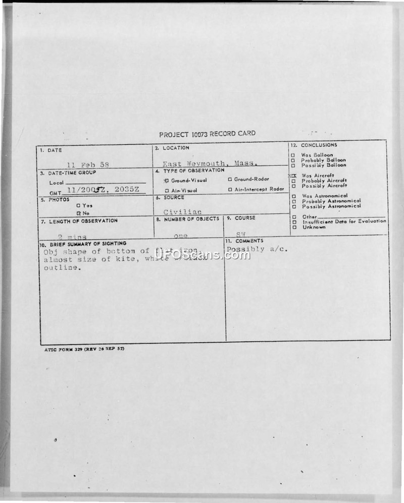 Project 10073 Record Card — East Weymouth, Mass., 11 Feb 58