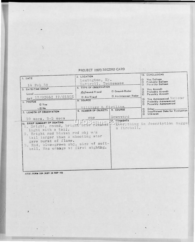 Project 10073 Record Card — Sighting in Luttrell, Tennessee, 16 February 1958