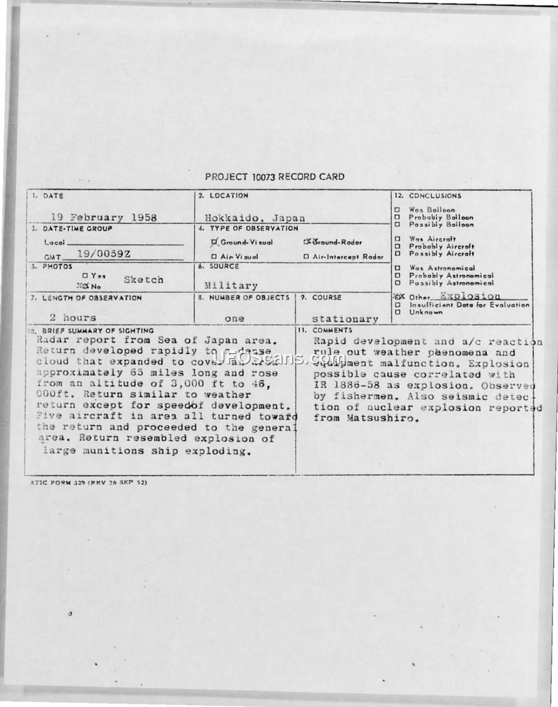 Project 10073 Record Card and Associated Reports — Hokkaido, Japan, February 1958
