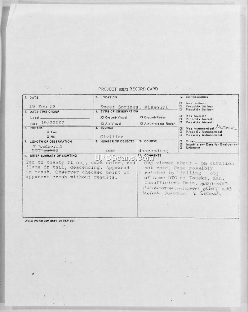 Unidentified Flying Object Report — Sweet Springs, Missouri, 19 February 1958
