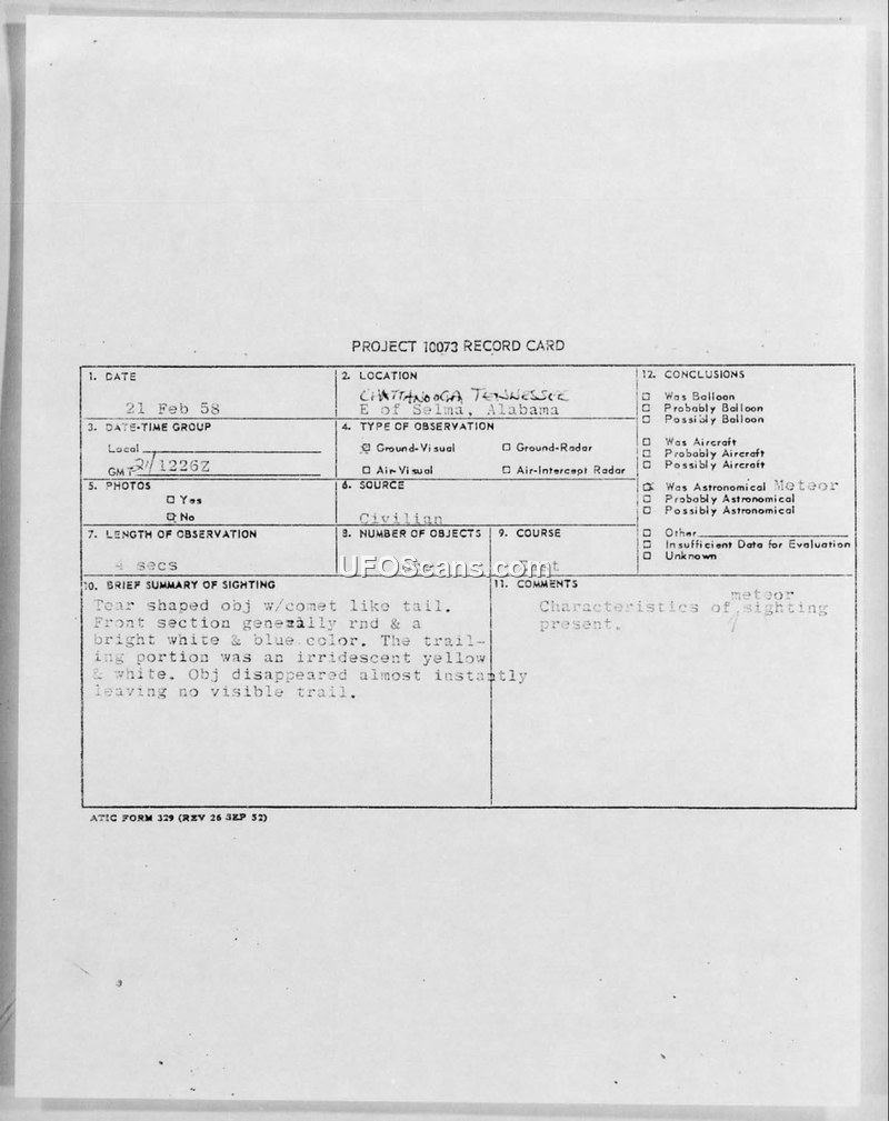 Project 10073 Record Card and Air Intelligence Information Report — Selma, Alabama, 21 February 1958