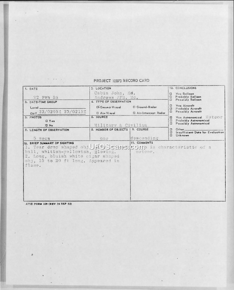 Project 10073 Record Card — Sighting at Cabin John, Md., 22 Feb 58