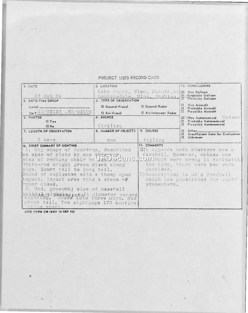 This document collection details the investigation into a UFO sighting that occurred on the night of February 22, 1958, near Lake Pepin, Wisconsin. Initial reports described a teardrop-shaped object, ranging in size from a plate to a rocking chair, displaying white, red, and bright green colors with a black edge and a long tail. Witnesses reported a sound like an explosion upon impact and the appearance of a steam or vapor cloud at the impact site. The 31st Air Division (Defense) initiated an investigation under the provisions of AFR 200-2. Investigators, including Lt. Col. R. Schumacher and Capt. Walter C. Neumann, conducted field interviews in Red Wing, Frontenac, Lake City, and Maiden Rock, Minnesota and Wisconsin. They interviewed several local residents, including a 65-year-old member of a junior astronomy club who claimed to have seen the object fall. However, investigators found this witness to be potentially unreliable due to his health and age. Other witnesses consistently described the phenomenon as a fireball. A search of the lake ice by the game warden and local fishermen yielded no evidence of an impact, such as holes or debris. The investigation concluded that the object was likely a meteor that penetrated the Earth's atmosphere at a low altitude. The Air Technical Intelligence Center (ATIC) expressed frustration over the delay in receiving the final report, noting that the 31st Air Division had not initially requested assistance from the 1006th AISS as required by regulations. The final consensus among military intelligence was that the incident was a natural phenomenon, and no further recovery actions were taken.