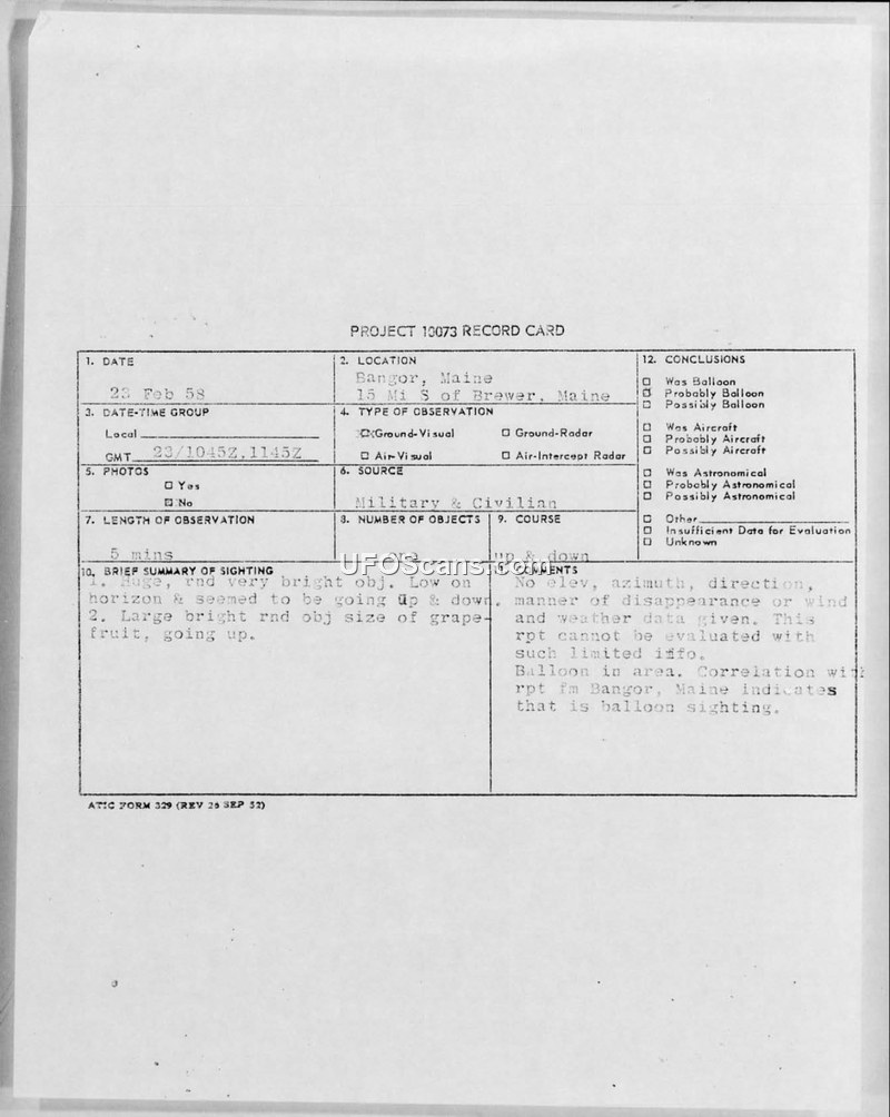 Project 10073 Record Card — Bangor, Maine, 23 February 1958