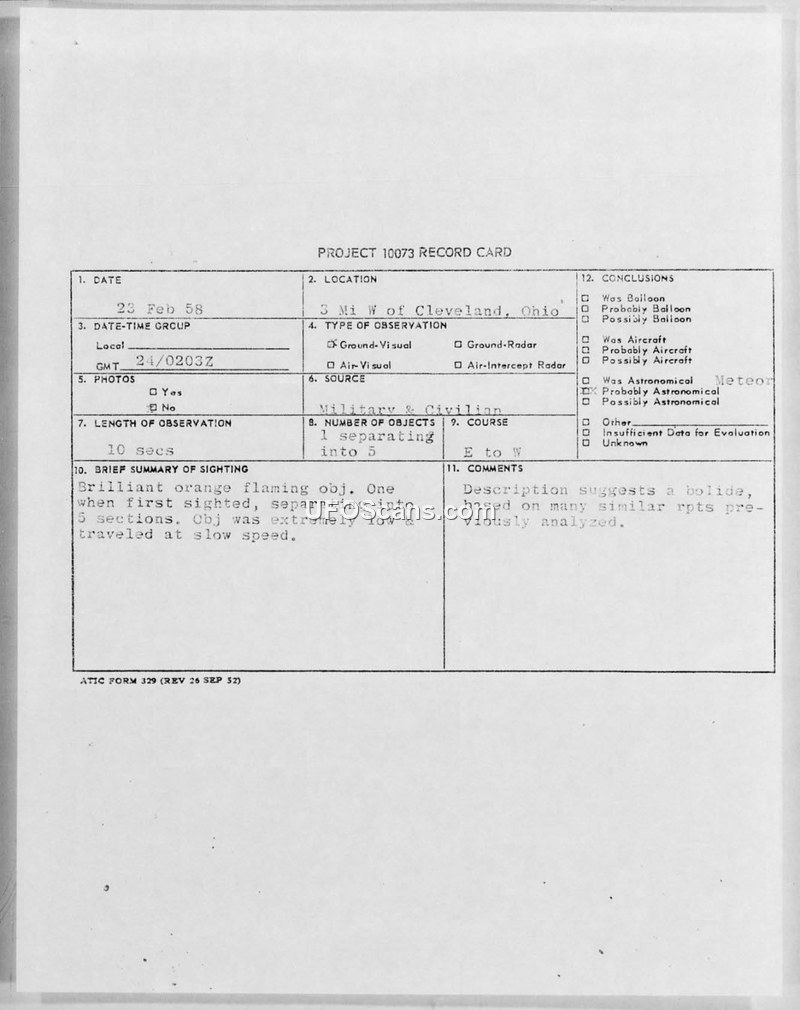 Project 10073 Record Card — Cleveland, Ohio, 23 February 1958