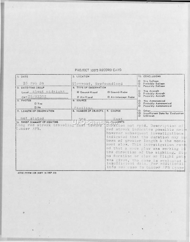 Project 10073 Record Card — Glenwood, Newfoundland, 25 February 1958