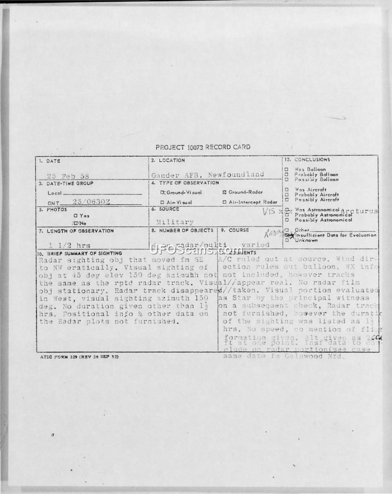 Project 10073 Record Card — Gander AFB, Newfoundland, 25 February 1958
