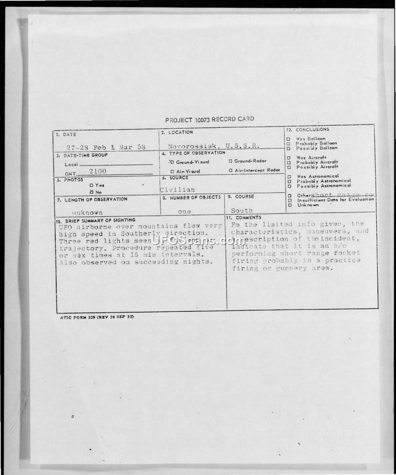 An intelligence report regarding a series of sightings near Novorossisk, USSR, in February 1958. The phenomena were officially attributed to short-range rocket firing operations.