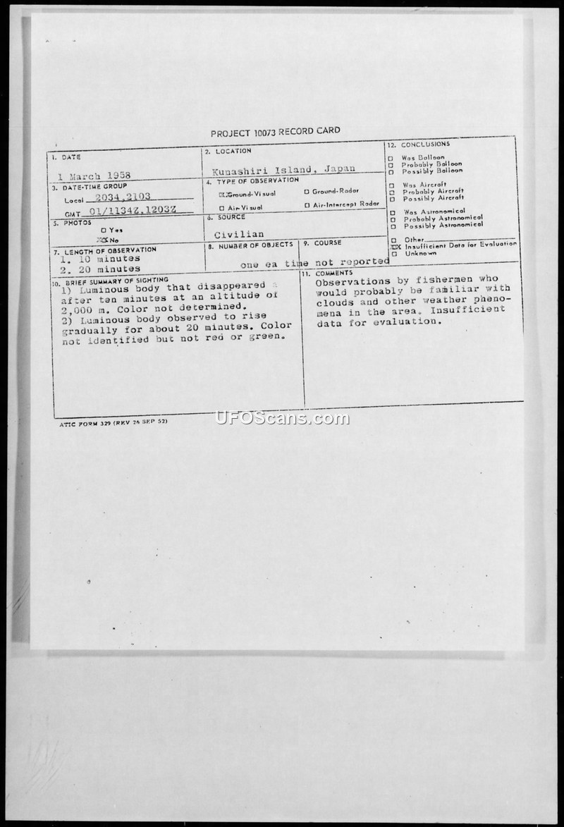 This report documents three luminous sightings off the Hokkaido coast in 1957 and 1958 as reported by local fishermen. Intelligence officials concluded there was insufficient data to evaluate the phenomena.