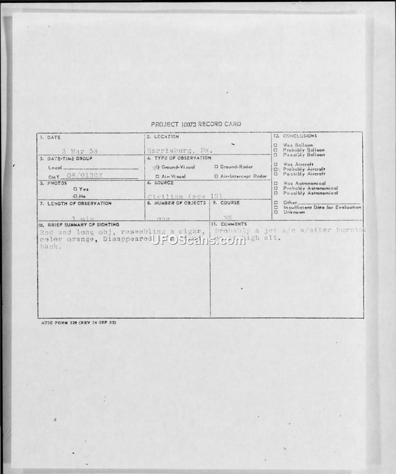 A 13-year-old witness reported a cigar-shaped, orange, and red object in Harrisburg, PA, on March 5, 1958. Military investigators concluded the object was likely a jet aircraft using afterburners at high altitude.