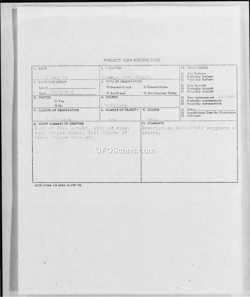 Project 10073 Record Card — Sighting at George AFB, California, March 1958