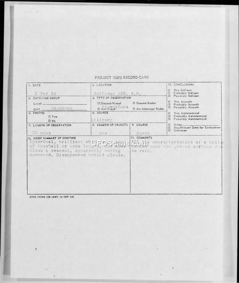 On 6 March 1958, at 0500Z, a spherical, brilliant white object was observed by personnel at Holloman Air Force Base, New Mexico. The object, described as being the size of a baseball held at arm's length, was spotted by the airdrome officer who alerted the tower operator. The object exhibited a slow climb and descent, moving in a northerly direction before disappearing behind clouds. The total duration of the observation was 35 minutes. The weather conditions at the time were reported as overcast with light rain. Although the object's behavior and appearance were noted as having characteristics of a weather balloon or a weather flare balloon, official records from the local weather station indicated that no such balloon was aloft at the time of the sighting. No physical evidence was recovered, and no radar contact was established. The final conclusion recorded on the project card suggests the object was a balloon forced near the ground surface due to rain, despite the lack of confirmation from local weather station logs.