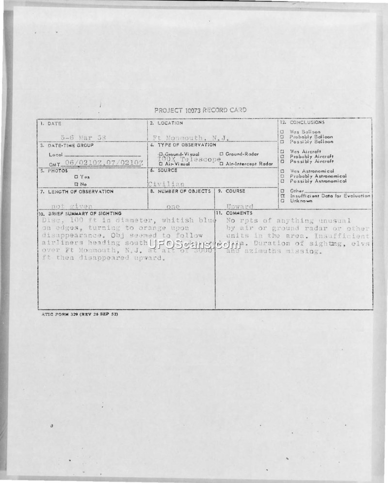 Two U.S. Signal Corps employees reported a disc-shaped object over Fort Monmouth, New Jersey, in March 1958. The Air Force investigation concluded there was insufficient data to evaluate the sighting.