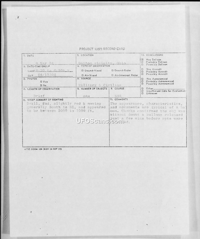 Project 10073 Record Card — Dayton, Ohio, 6 March 1958
