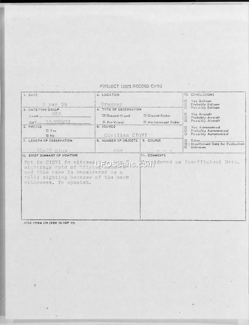 This document is a Project 10073 record card and associated investigation file regarding a UFO sighting in Uruguay on March 9, 1958. The primary witness, a bus driver, reported observing an unidentified object while on a routine route in the early morning hours. The witness described the object as an oval-shaped craft with a cupola on top, measuring approximately 50 to 70 meters in size. The object reportedly hovered at a low altitude of 10 to 20 meters, displaying rotating red, green, and white-yellow lights, with an intermittent red light on the top. The witness noted that the object moved rapidly in horizontal directions before eventually departing violently toward the southwest at a 45-degree angle. The duration of the sighting was estimated at 60 to 70 minutes. The investigation was conducted by the Centro de Investigacion de Objetos Voladores Inidentificados (C.I.O.V.I.), an Uruguayan organization associated with the Uruguayan Air Force Intelligence Service. C.I.O.V.I. concluded that the evidence was clear and that the object could be described as a 'flying saucer,' noting that the case shared coincidences with other classic reports. Despite the local investigation's confidence in the witness's reliability, the U.S. Air Technical Intelligence Center (ATIC) record card concludes that the case provided 'Insufficient Data for Evaluation.' The file includes the original Spanish-language questionnaire completed by the witness, detailing the lack of sound, the absence of electromagnetic interference, and the clear weather conditions during the event.