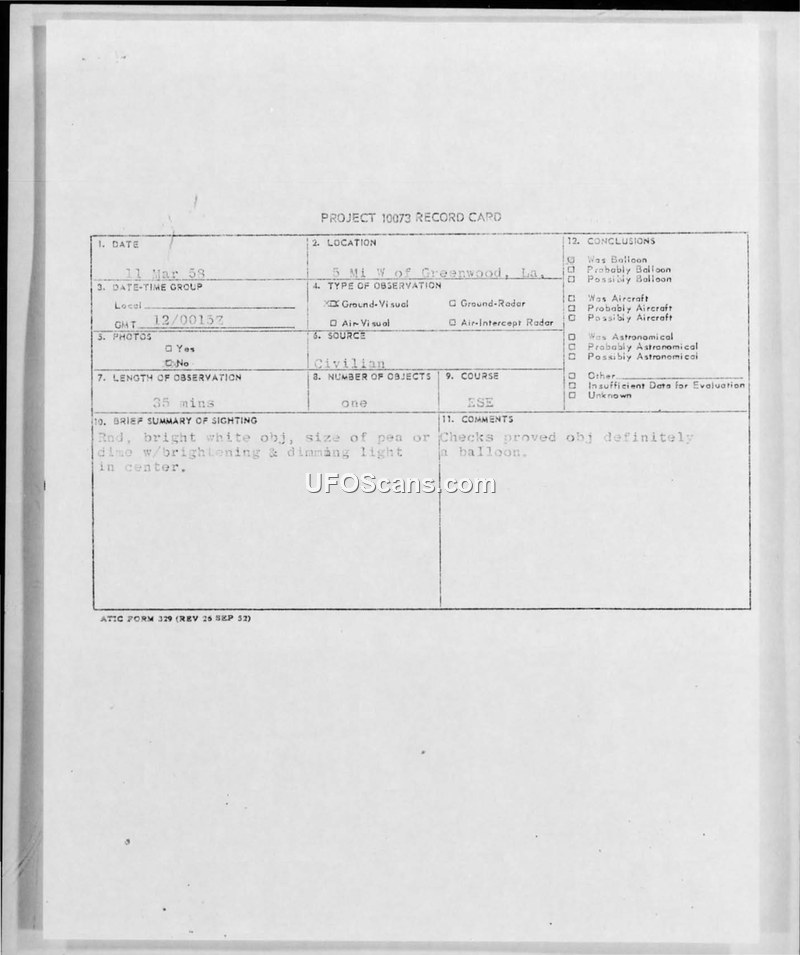 A civilian reported a bright, round object in Greenwood, Louisiana, on March 11, 1958. Military authorities investigated the sighting and concluded it was a weather balloon.