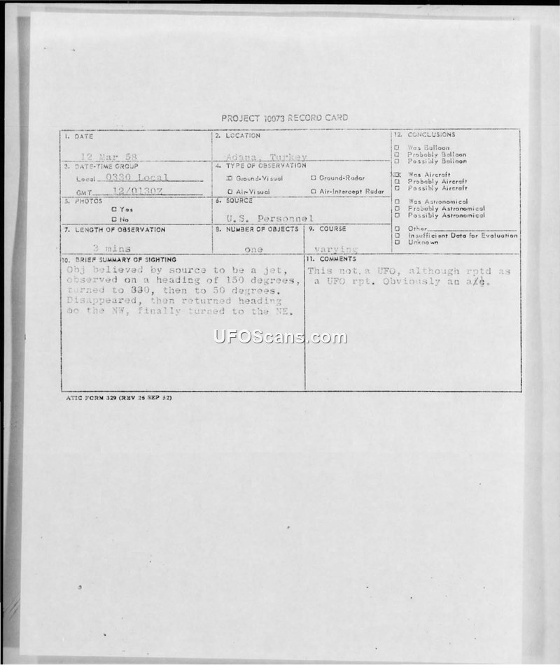 Review and Comment - UFO Rpt, Adana, Turkey 12 Mar 58