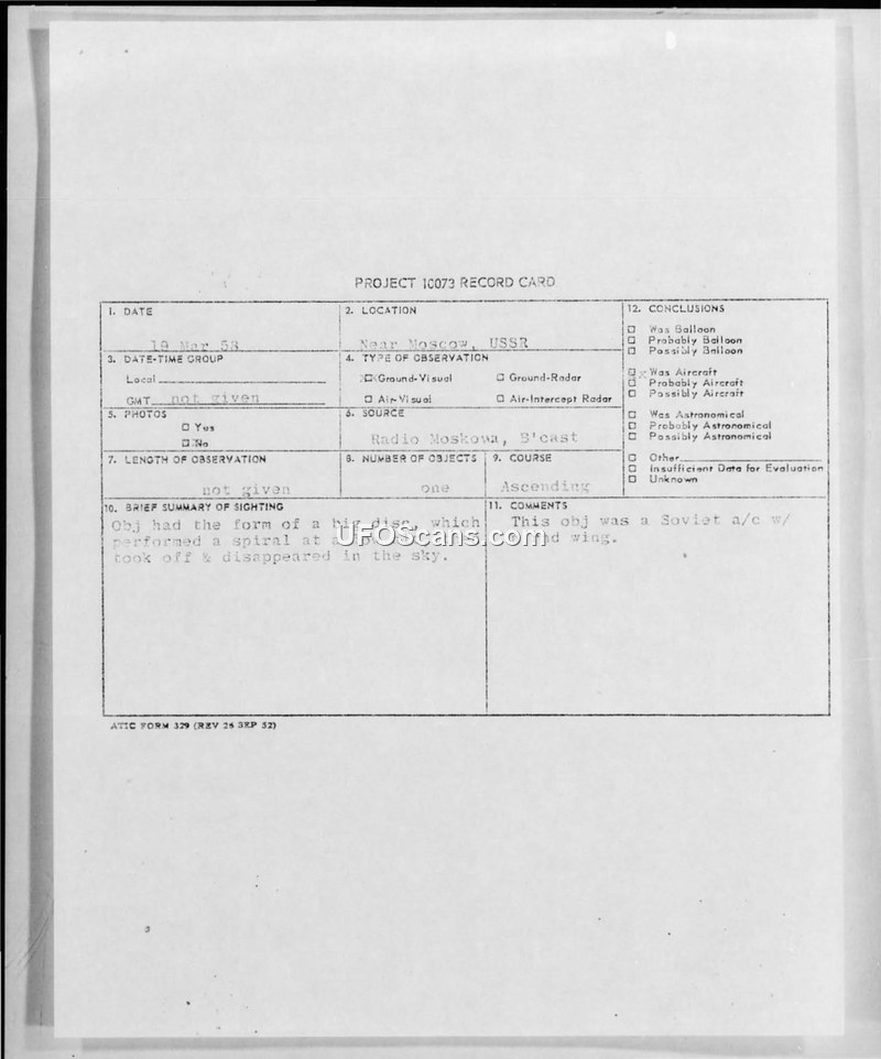 This document consists of a Project 10073 record card and an associated memorandum regarding a sighting reported near Moscow, USSR, on March 19, 1958. The initial report originated from a Radio Moskva broadcast, which described a 'curious' flying object observed at an altitude of 3,000 meters. Eyewitnesses described the object as a large disk that performed a spiral maneuver at low altitude before departing. The intelligence assessment, prepared by Captain Anthony M. Klasinski of the 7050th Air Intelligence Security Group, concludes that the object was not an unidentified aerial phenomenon in the traditional sense, but rather a Soviet aircraft equipped with a 'round wing.' The report highlights that this specific aircraft design is characterized by its stability, maneuverability, and, as noted in a follow-up card, its capacity for vertical takeoff. The document includes a routing slip indicating that this information was compiled in response to a specific query from a Dr. Shelton regarding 'flying saucer' reports originating from within the Soviet Union. The author notes that the information received from the USSR does not constitute 'saucer' reports, but rather identifies unidentified aircraft or indications of Soviet aviation activities. The report is classified as unclassified and was finalized on July 30, 1958.
