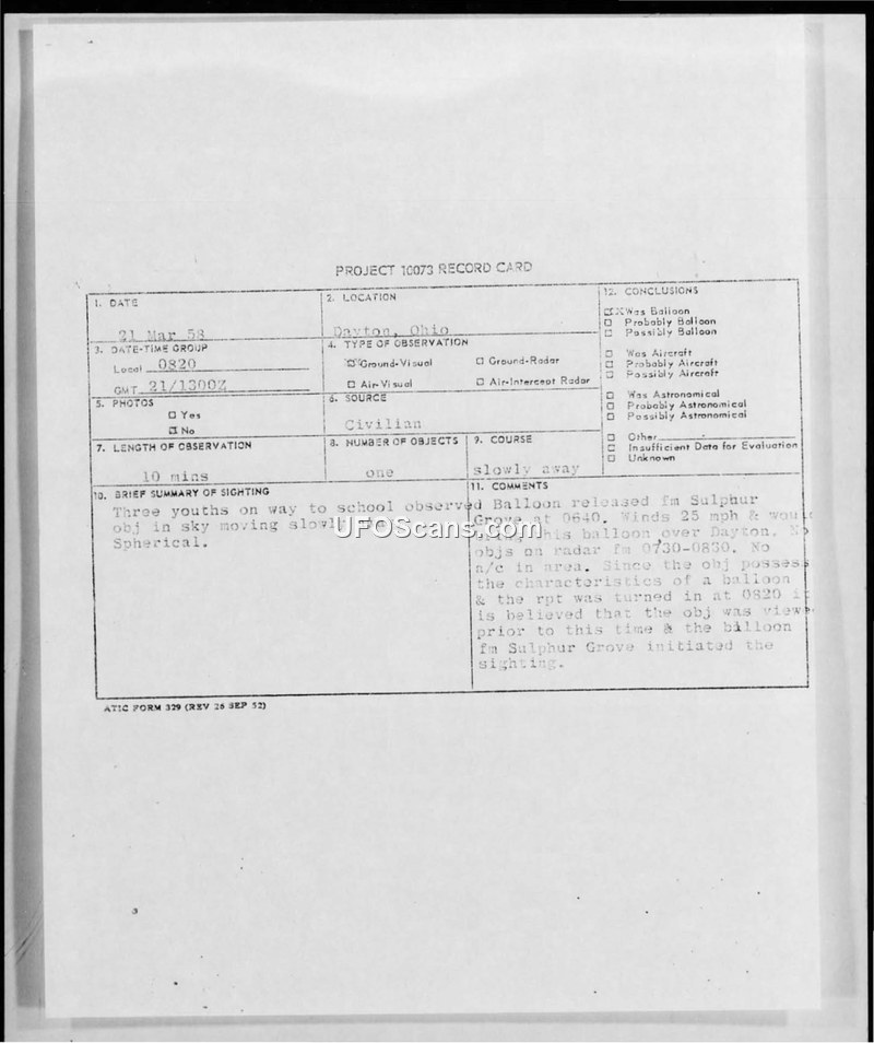 Project 10073 Record Card — 21 March 1958, Dayton, Ohio
