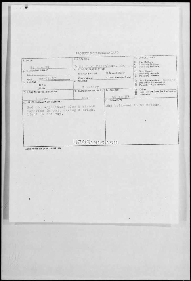 A military pilot reported a greenish, streaking object over Carrollton, Missouri, on March 24, 1958. The Air Technical Intelligence Center concluded the object was a meteor.