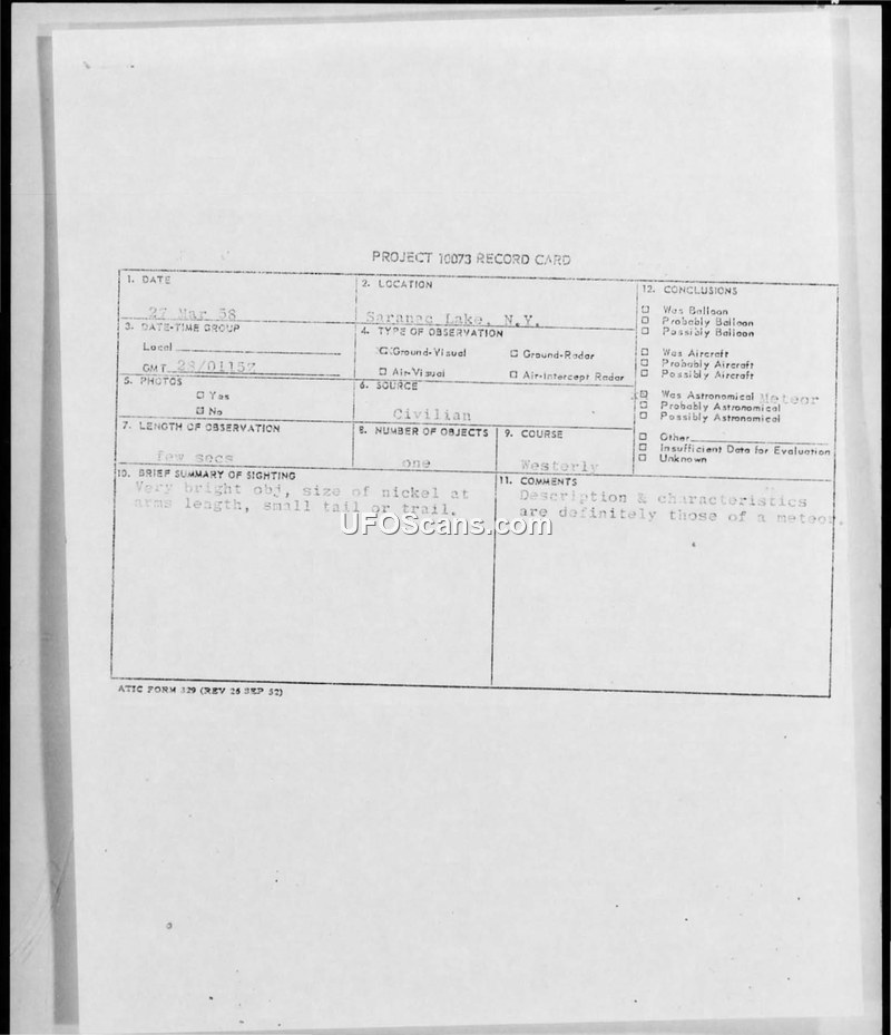 Project 10073 Record Card and Air Intelligence Information Report — Saranac Lake, New York, 27 March 1958