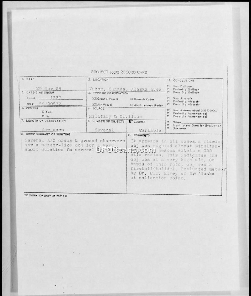 Multiple observers in Alaska and the Yukon reported a brilliant, flaming object on March 29, 1958. ATIC concluded the object was a natural meteor (bolide) based on its high velocity, fragmentation, and acoustic characteristics.