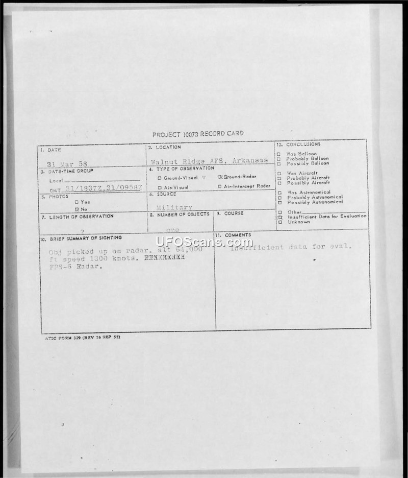 Project 10073 Record Card — Walnut Ridge AFS, Arkansas, 31 March 1958