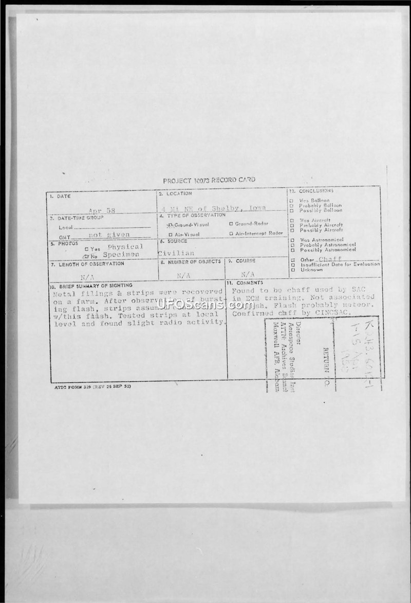 This document collection details an investigation into a reported UFO sighting near Shelby, Iowa, in April 1958. The incident involved a witness report of a 'bursting flash' in the sky. Following this event, metal filings and strips were discovered on a local farm. These materials were subsequently tested at the Janney General Hospital in Council Bluffs, Iowa, where they were found to be slightly radioactive. The report was initially handled by the Ground Observer Corps and later escalated to the Air Technical Intelligence Center (ATIC) under the reference SAC-158-1066. The military investigation, conducted under the auspices of Project 10073, concluded that the recovered metal strips were not extraterrestrial in origin but were instead chaff used by the Strategic Air Command (SAC) during electronic countermeasures (ECM) training exercises. The flash reported by the witness was determined to be a separate event, likely a meteor. The final assessment from ATIC, dated May 1958, confirmed the material as chaff and stated that no further action would be taken regarding the report.
