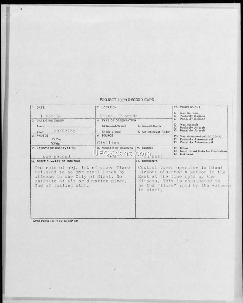 This document collection contains a series of Project 10073 record cards, military correspondence, and disposition forms detailing multiple UFO sightings in the Miami, Florida area during April and May 1958. The reports originate from various sources, including civilian witnesses, the U.S. Coast Guard, and personnel at the Miami International Airport. On 1 April 1958, a civilian witness reported a green flare over Miami Beach, which was subsequently described by a tower watch supervisor at Miami International Airport as a 'falling star' observed in the East for approximately one second. Later in the month, on 30 April 1958, a U.S. Coast Guard report described a bright, unidentified light in the sky, observed for 20 seconds, moving in a semi-circular arc toward the southwest. This object was described as bright white and did not appear to be an aircraft. A subsequent report from the same source on 1 May 1958 noted a similar object moving from the West to the North. Military authorities, specifically the Air Technical Intelligence Center (ATIC), evaluated these reports. While some initial assessments suggested the possibility of aircraft due to the reported maneuvers, the official conclusions consistently leaned toward astronomical phenomena, specifically meteors. One investigator noted that while the duration of the 30 April sighting was 'rather long,' it was likely a meteor at a high altitude. The documents include formal requests for radar checks to verify if any other units had tracked the objects, though no evidence of such tracking is provided. The correspondence reflects the standard procedure for the Air Force to document and evaluate these reports under the auspices of Project 10073 and AFR 200-2.