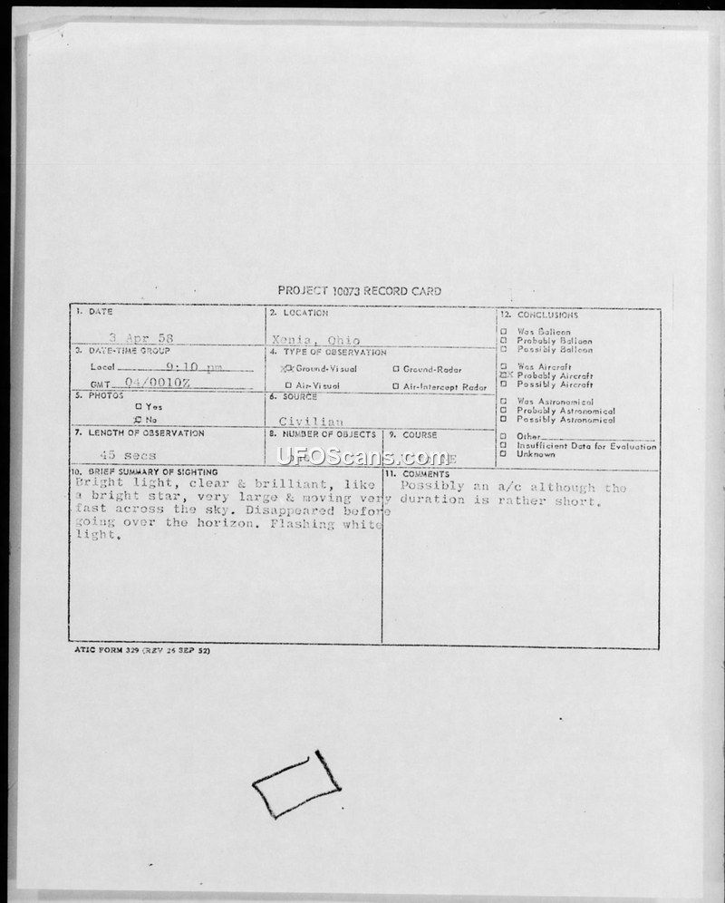 Project 10073 Record Card — Xenia, Ohio, 3 April 1958