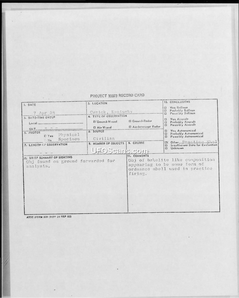 This document collection details the recovery and subsequent investigation of an unidentified object found on a farm near Cuzick, Kentucky, on April 7, 1958. The object, described as cone-shaped and resembling a missile nose cone, was discovered by a local resident after he observed a fiery object falling from the sky. The object was noted to have a 'bakelite-like' composition and reportedly had a tape-like material trailing from it. The recovery process involved multiple agencies, including the Federal Bureau of Investigation (FBI) and the Office of Special Investigations (OSI). The object was eventually transferred to the Air Technical Intelligence Center (ATIC) at Wright-Patterson Air Force Base for analysis. Correspondence between military offices indicates that the object was initially treated as a potential unidentified aerial phenomenon under Project 10073. However, internal evaluations by the Air Weapons Materials Branch suggested that the object was likely a component of practice ordnance. The file includes a Project 10073 record card, internal memoranda, and photographic evidence of the recovered object, which was ultimately classified as a piece of practice shell rather than an anomalous aerial phenomenon. The investigation concluded that further materials analysis was unnecessary once the object was identified as conventional military debris.