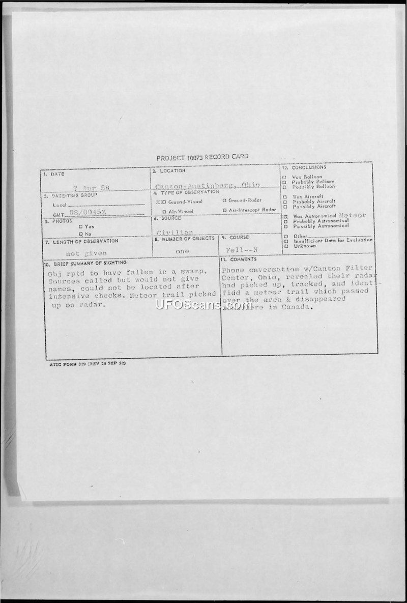 Project 10073 Record Card: Canton-Austinburg, Ohio Sighting