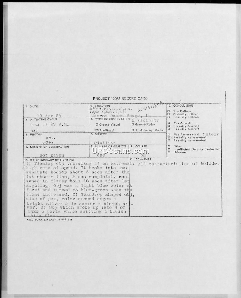 PROJECT 10073 RECORD CARD — Sighting Incident, 10 April 1958, Lake Charles, Louisiana