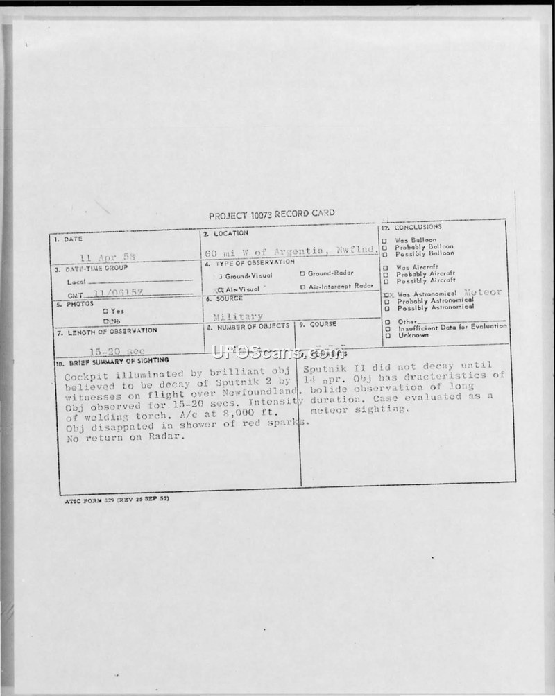 Project 10073 Record Card: Sighting near Argentia, Newfoundland, 11 April 1958
