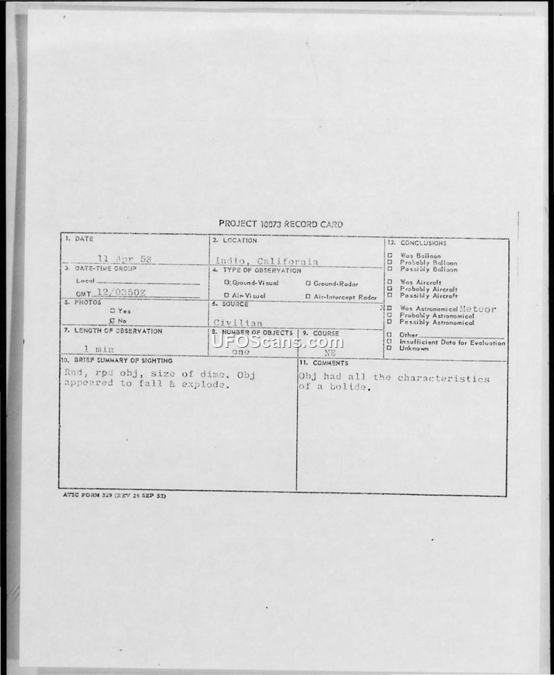 This document consists of a Project 10073 record card and associated teletype communications regarding an unidentified aerial phenomenon observed in Indio, California, on April 11, 1958. The witness, a 54-year-old retired construction worker, reported observing a round, red object, described as being the size of a dime, which appeared to fall and explode. The observation lasted approximately one minute. The witness reported the object traveling from the southwest to the northeast. The report was processed by the 27th Air Division Defense and forwarded to the Air Defense Command and the Air Technical Intelligence Center (ATIC). Major Loren W. Bruner, Director of Intelligence, initially suggested the object could be a meteor or possibly 'moon dust.' Subsequent internal annotations on the document indicate a consensus that the object exhibited the characteristics of a bolide (fireball), referencing an evaluation by a Dr. Olveas. The report confirms that there were no radar contacts or photographs associated with the event, and weather conditions were reported as clear. The document serves as a standard military intelligence record for UAP sightings during this period, documenting the investigative process from initial report to final classification.