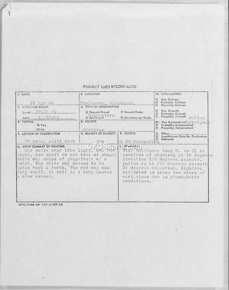 This document details a UFO sighting investigation conducted by the Air Technical Intelligence Center (ATIC) and the 1006th Air Intelligence Service Squadron regarding an incident on April 12, 1958, in Manitowoc, Wisconsin. Two nuns at the Holy Family Convent reported observing two unidentified flying objects. The witnesses described the objects as red, circular, and grapefruit-sized, exhibiting erratic movements including hovering, bouncing, and changing colors. The witnesses were interviewed by the local Civil Air Patrol and later by Air Force personnel. The investigation was handled with sensitivity due to the witnesses' reluctance to face public scrutiny and the Air Force's concern that the incident might be exploited by 'flying saucer' proponents. Major Ralph N. Albright of Detachment 7, 1006th AISS, conducted the interviews and compiled the data. The official conclusion reached by the Air Force was that the sightings were misidentifications of the stars Betelgeuse and Pollux, with apparent movement and color changes attributed to atmospheric conditions and potential confusion with surface lights. The file includes the original Project 10073 record card, official correspondence between ATIC and the 1006th AISS, transcripts of interviews with the witnesses, and technical information sheets completed by the observers.