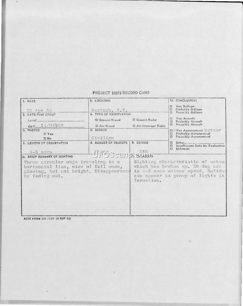 Project 10073 Record Card and Teletype Report — Wantagh, N.Y., 14 April 1958
