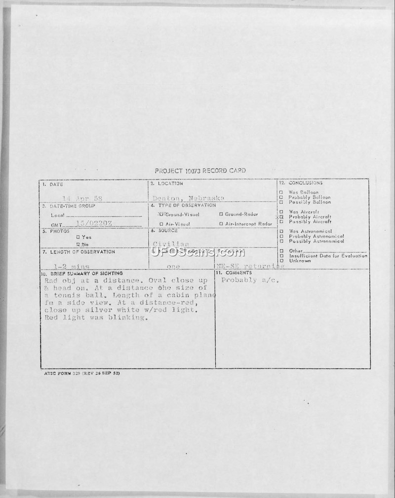 Project 10073 Record Card — Denton, Nebraska, 15 April 1953