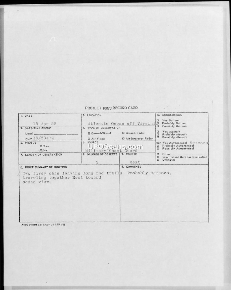 A 1958 military report documents the sighting of two objects with red trails over the Atlantic Ocean. The incident was officially evaluated as likely being meteors.