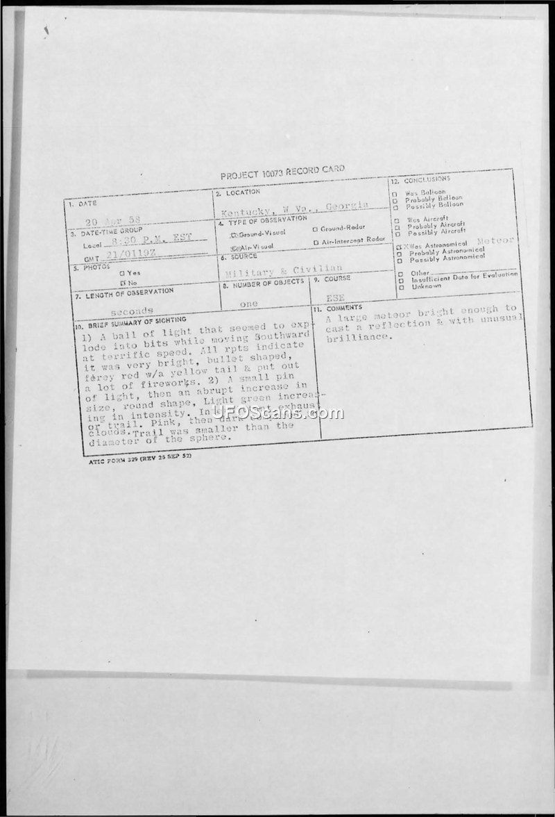 On April 21, 1958, military pilots and civilians observed a bright, bullet-shaped object moving across the southeastern U.S. The Air Technical Intelligence Center concluded the object was a meteorite.