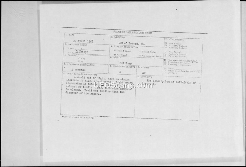 The sighting on 20 April 1958 was identified as a fireball. The document also provides a list of other fireball sightings from 1958 and 1959 to assist academic research.