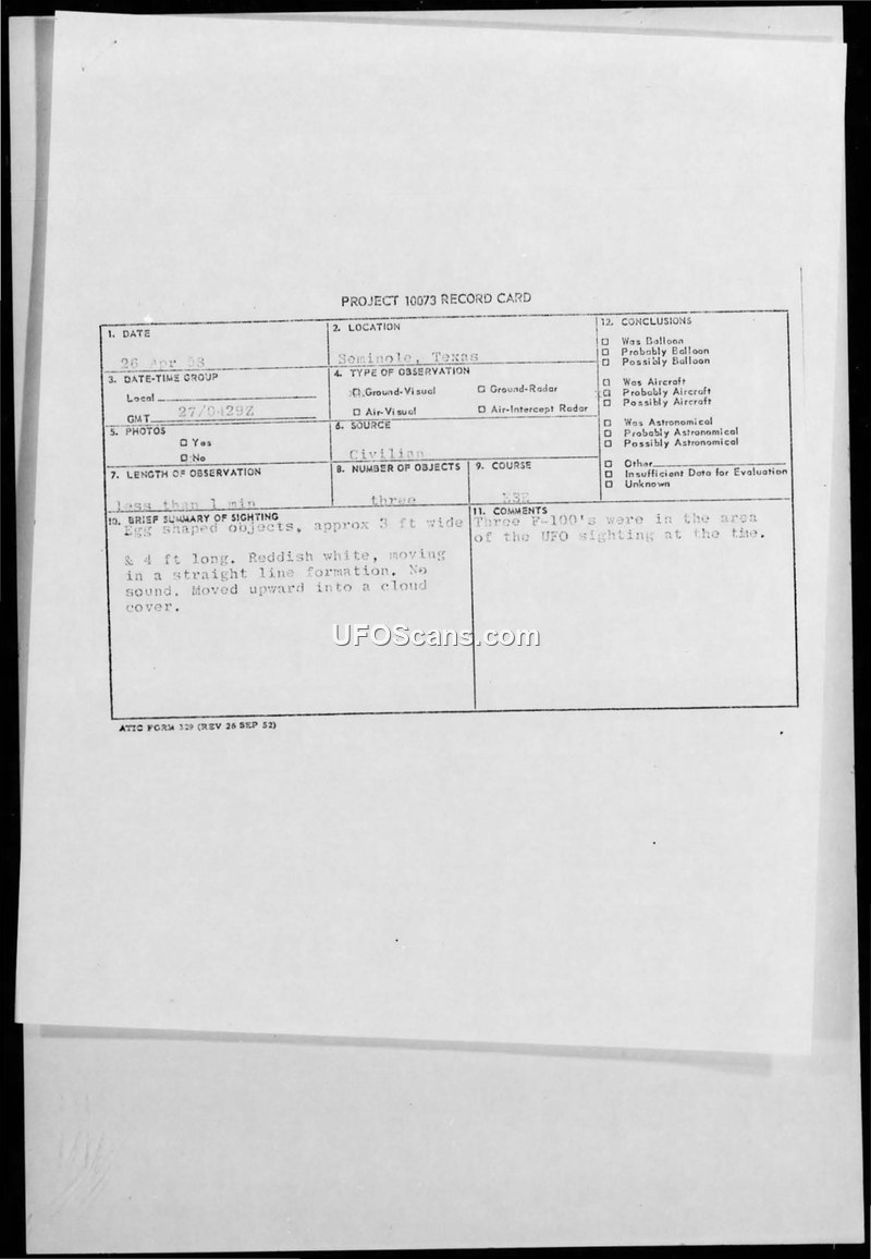 A civilian in Seminole, Texas, reported three egg-shaped objects on April 27, 1958. Military investigation confirmed F-100 aircraft were in the area, but the cause of the sighting remained unknown.