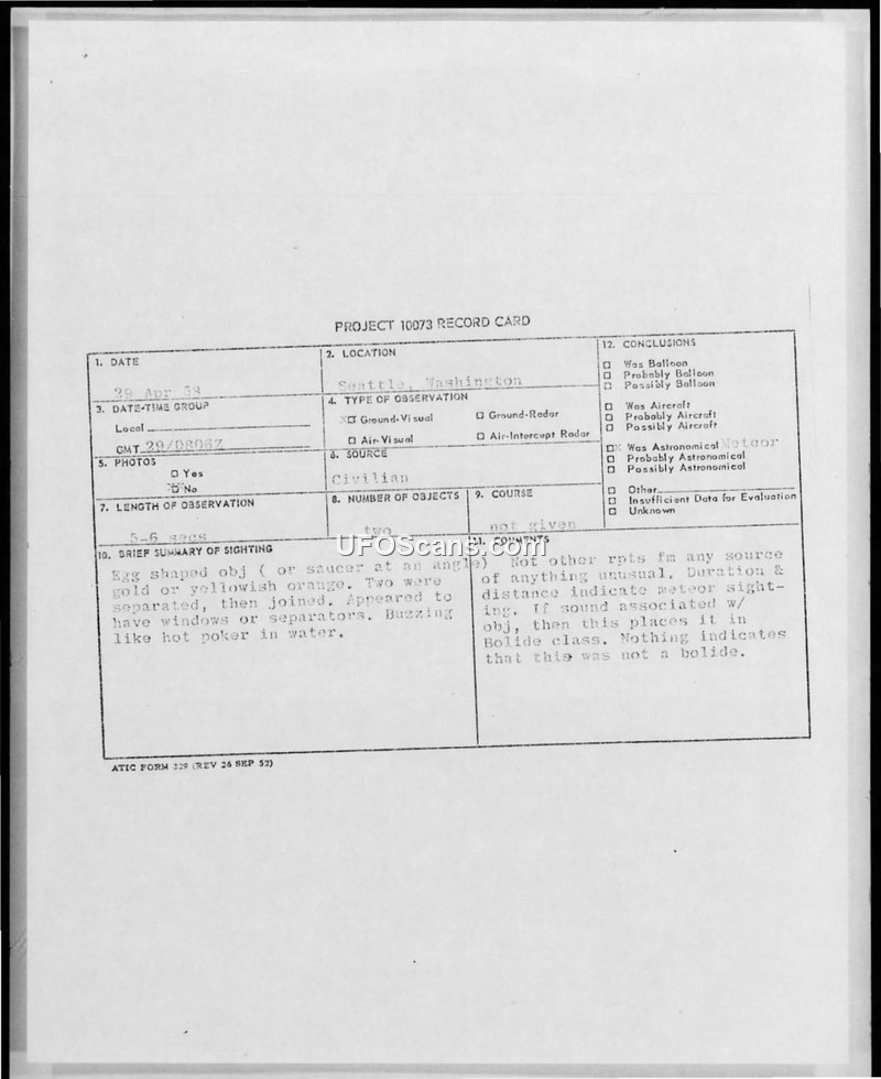 PROJECT 10073 RECORD CARD - Sighting Report, Seattle, Washington, 29 April 1953